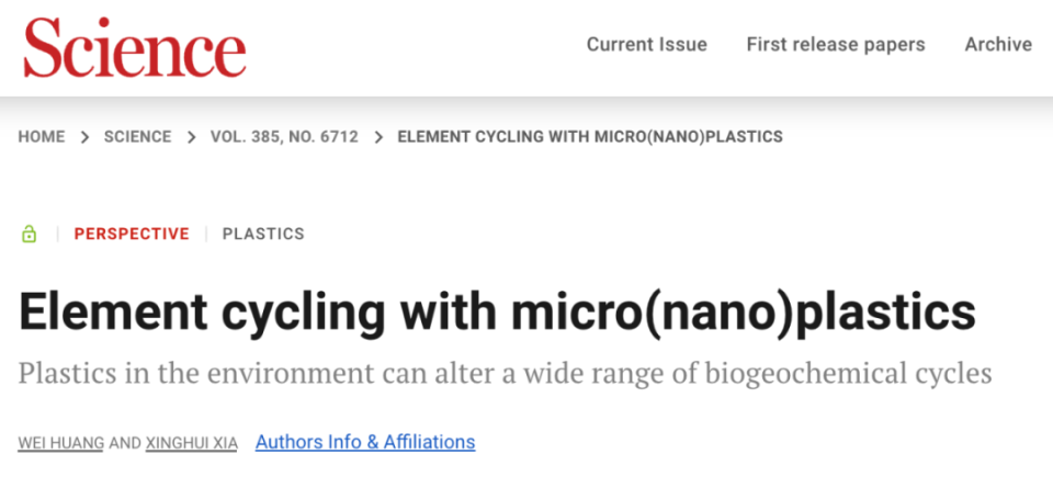 Science发表了题为“Element cycling with micro(nano)plastics”的展望论文(Perspective)。从“微塑料循环”的视角下阐明了微纳米塑料对全球碳、氮等元素生物地球化学循环以及温室气体排放的影响机制。